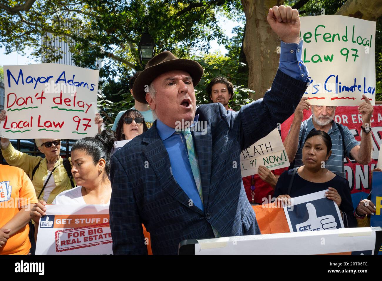 New York, USA. 21st July, 2023. Eric Weltman speaks at a rally